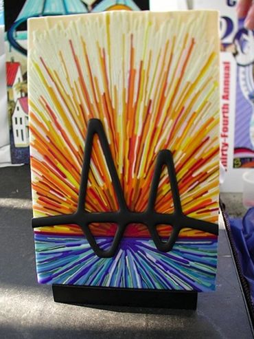 Greg Rawls, a Charleston artist, beat 66 other entrants in the panel-judged contest with a kiln-formed glass panel depicting a silhouette of the Arthur Ravenel Jr. Bridge in front of a fiery rising sun. The sun’s rays, as well as the bridge itself and the river below, are made of 1/2-inch-thick strips of glass that Rawls arranged on a glass plate and heated to 1,450 degrees for an entire day.