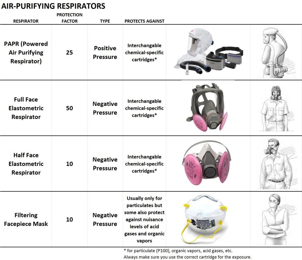 Used particulate exposure but there are some specifically designed that add protection for nuisance levels of acid gas or organic vapors. Referred to as a N95. It has a protection factor of 10. Not always the best fit to face. Throw away when dirty.